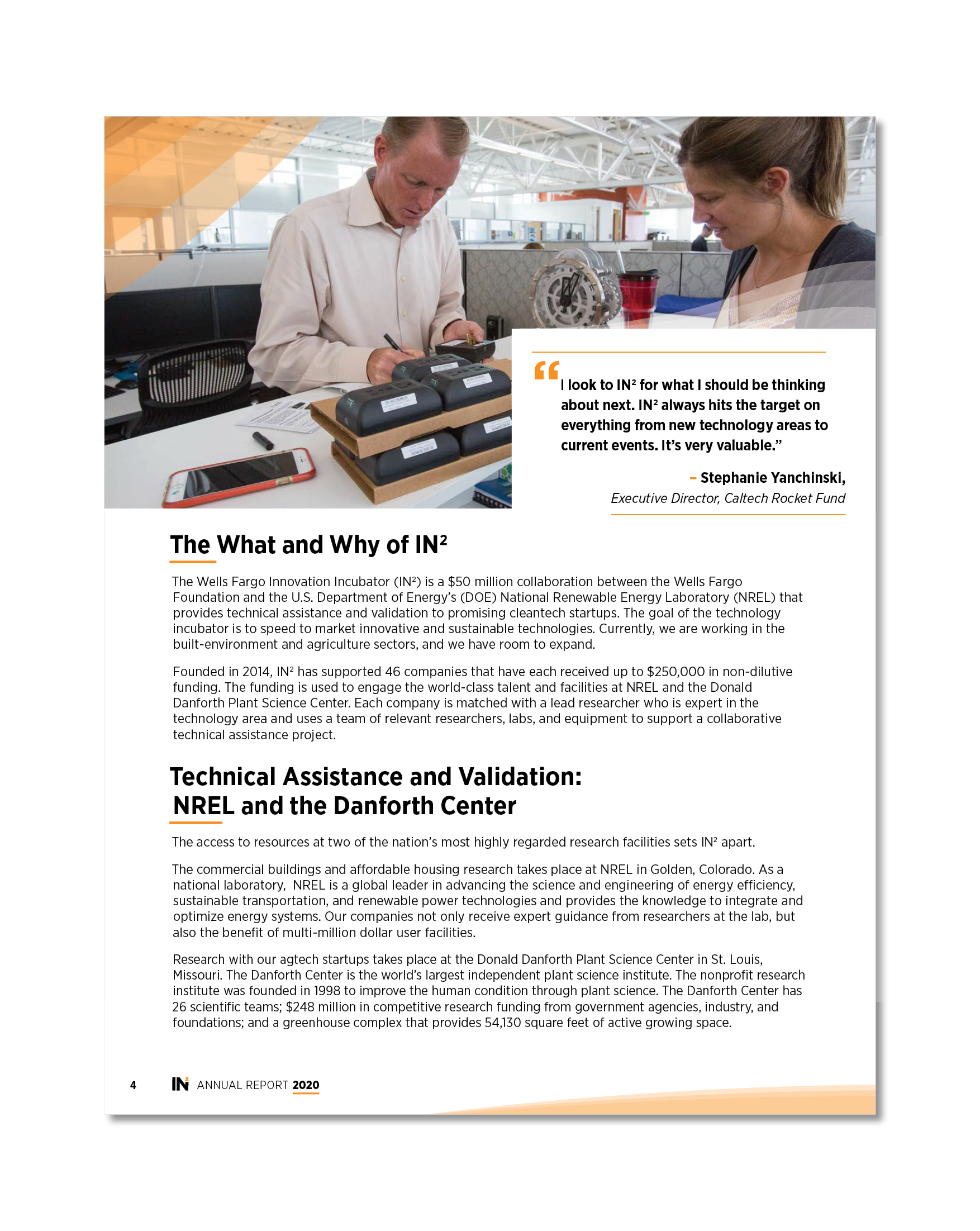 Annual reports designed for the Wells Fargo/NREL Innovation and Entrepreneurship Center IN2 program. Produced both in print and digital, these documents successfully communicate the accomplishments of IN2 for the years 2019 and 2020.